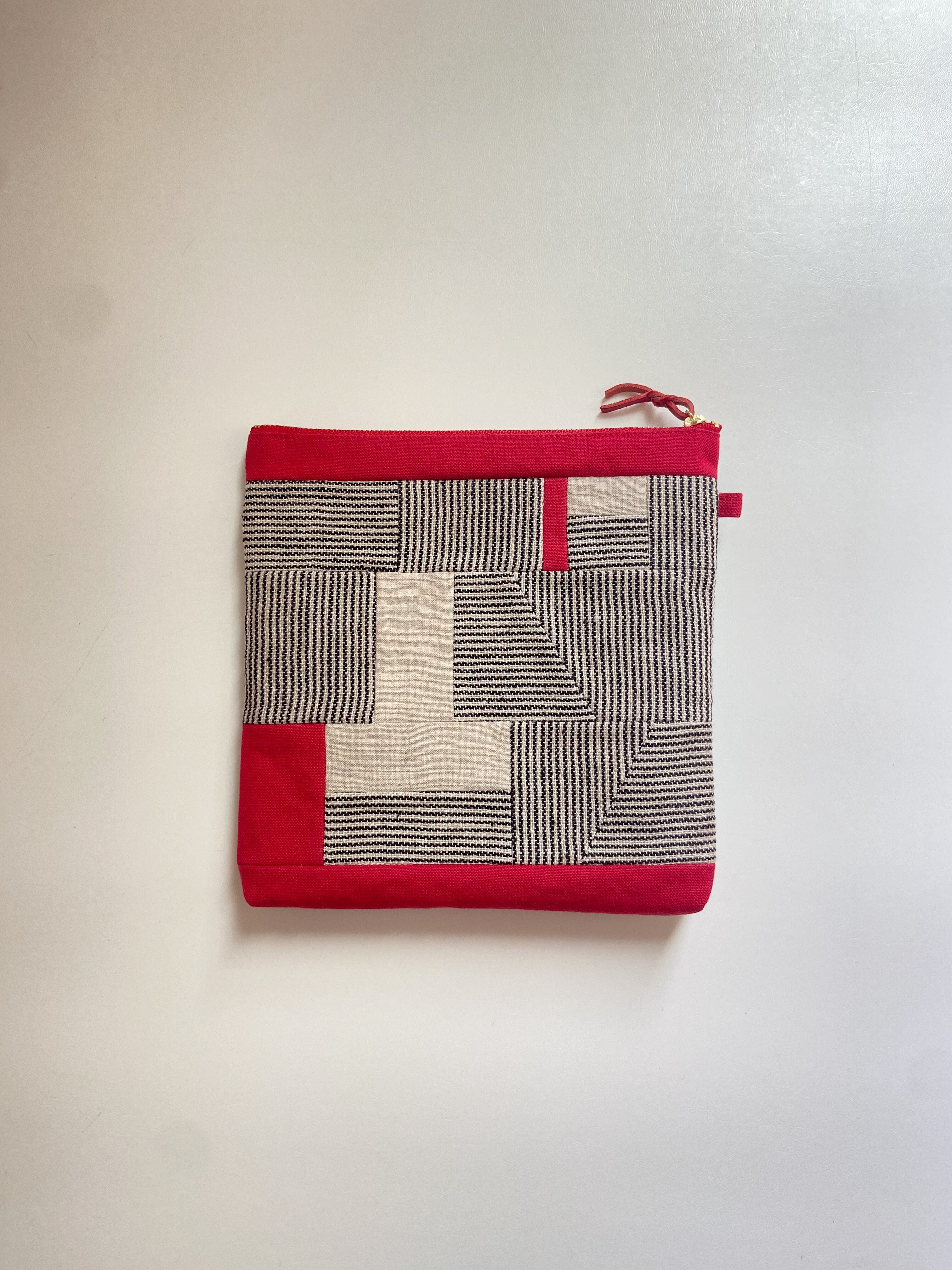 手織で作ったピンストライプ布を たてよこななめに配置したパッチワークポーチ。