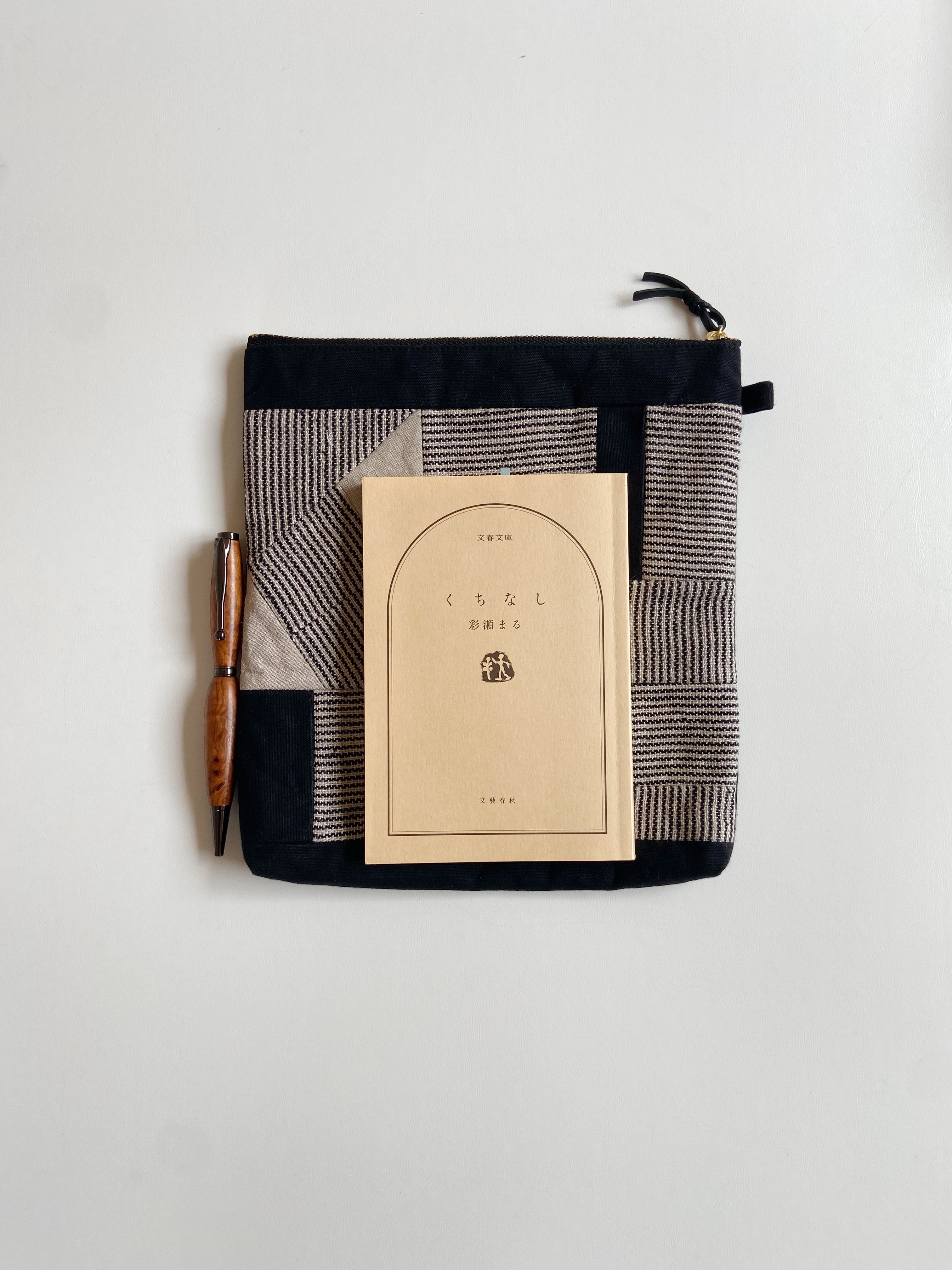手織で作ったピンストライプ布を たてよこななめに配置したパッチワークポーチ。