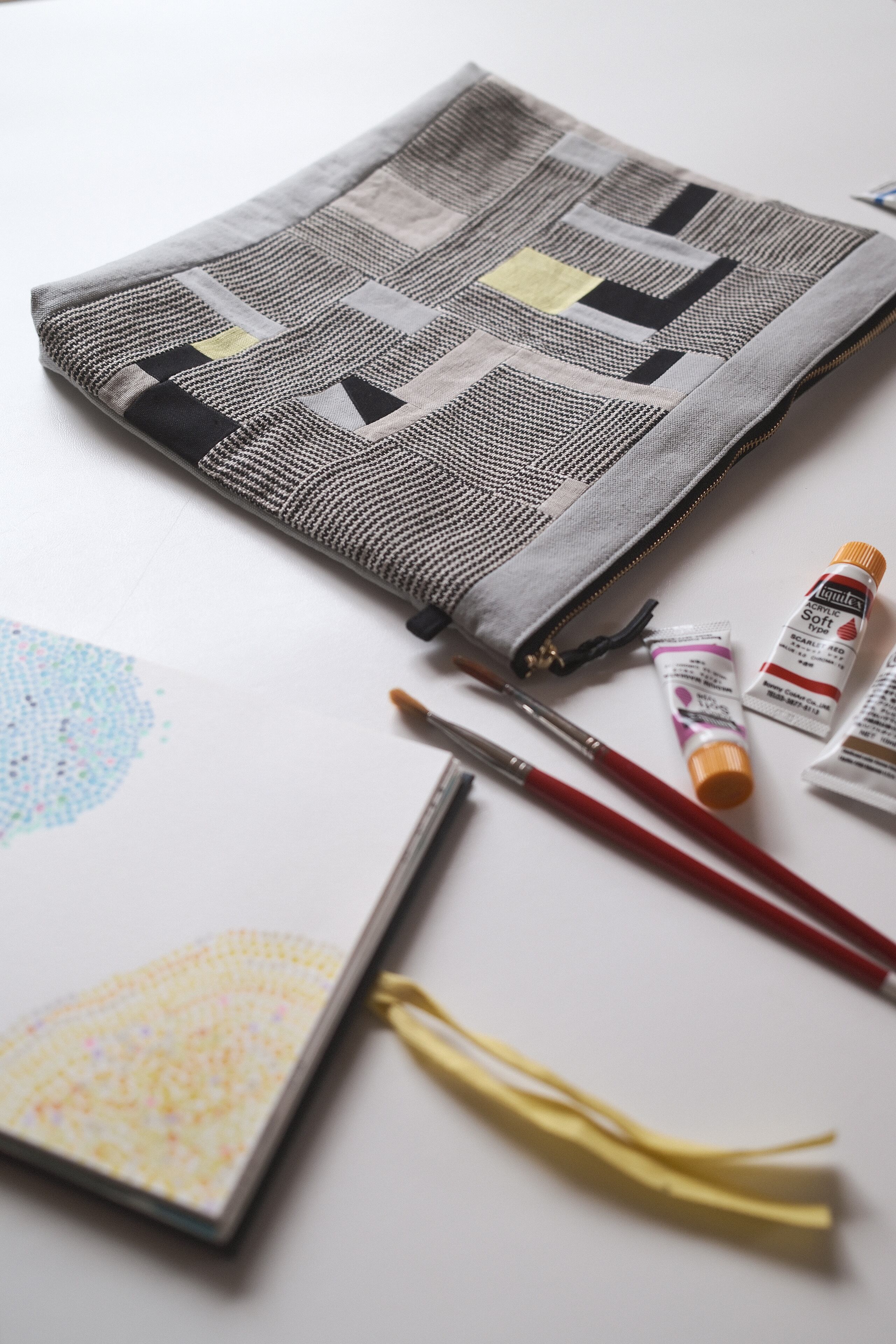 手織で作ったピンストライプ布を たてよこに配置したパッチワークポーチ。