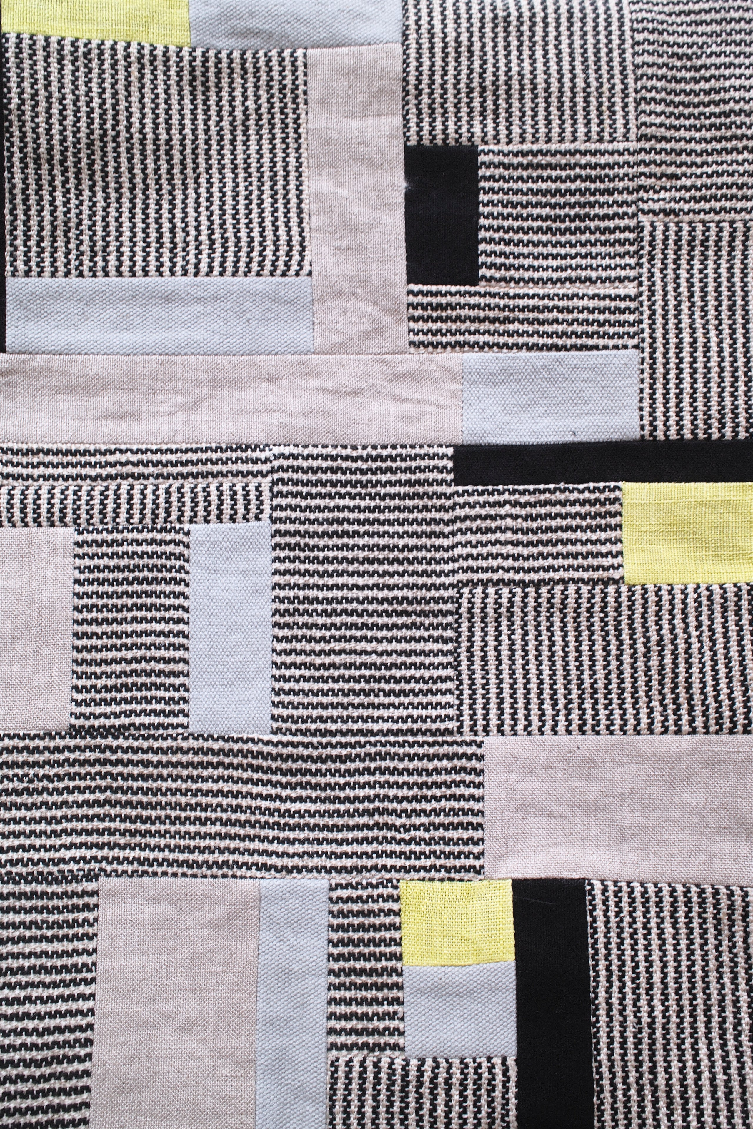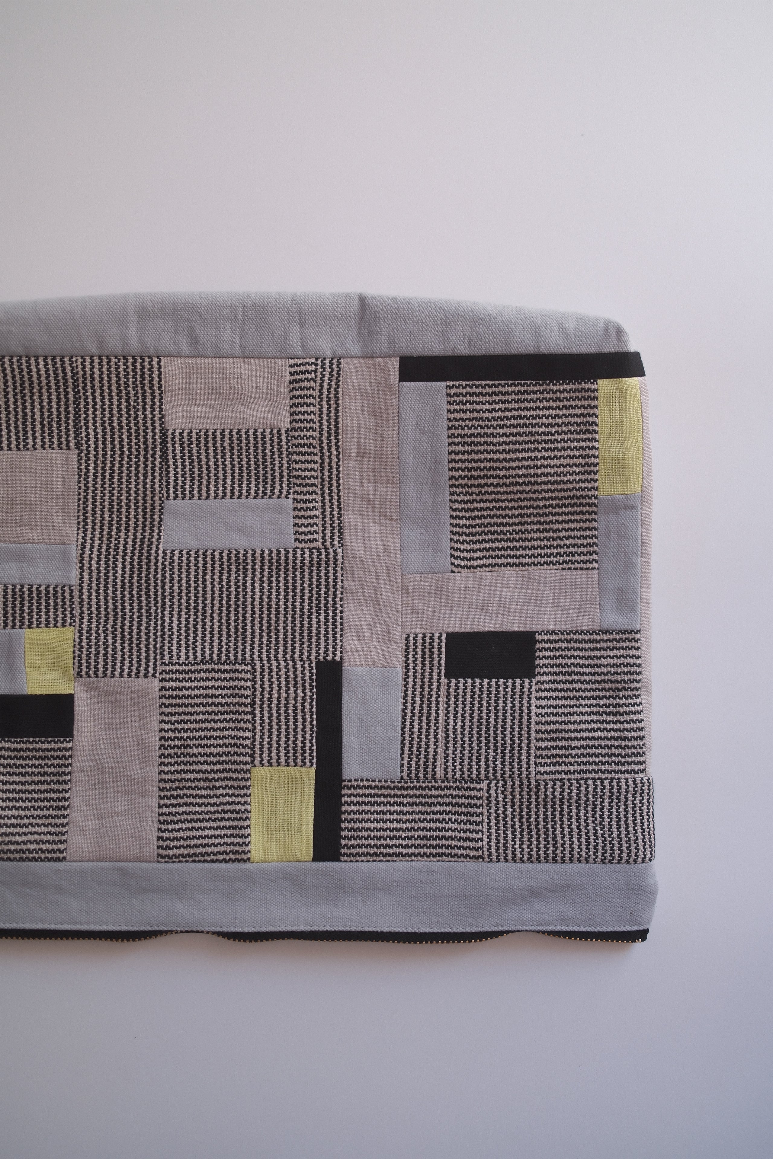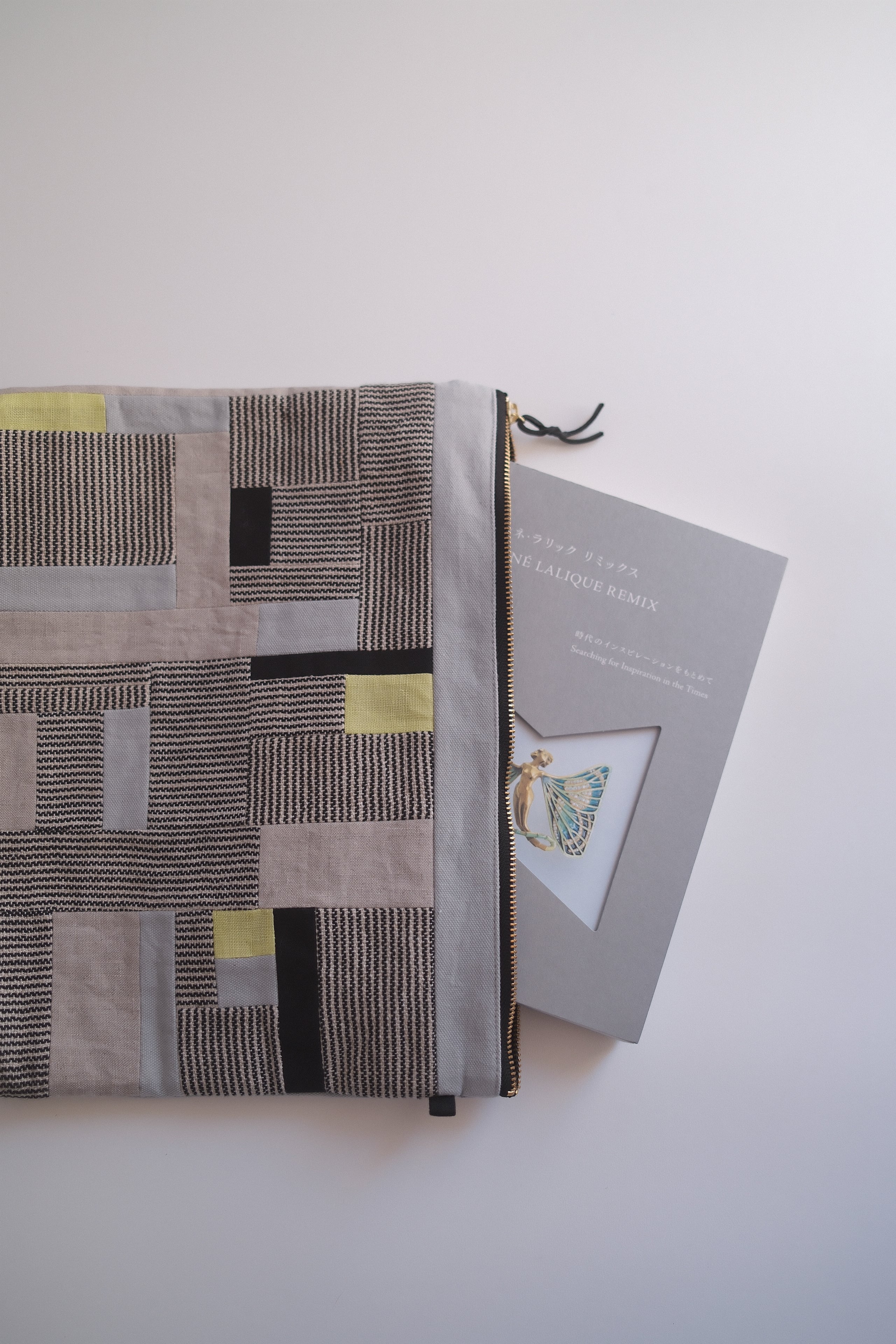 手織で作ったピンストライプ布を たてよこに配置したパッチワークポーチ。