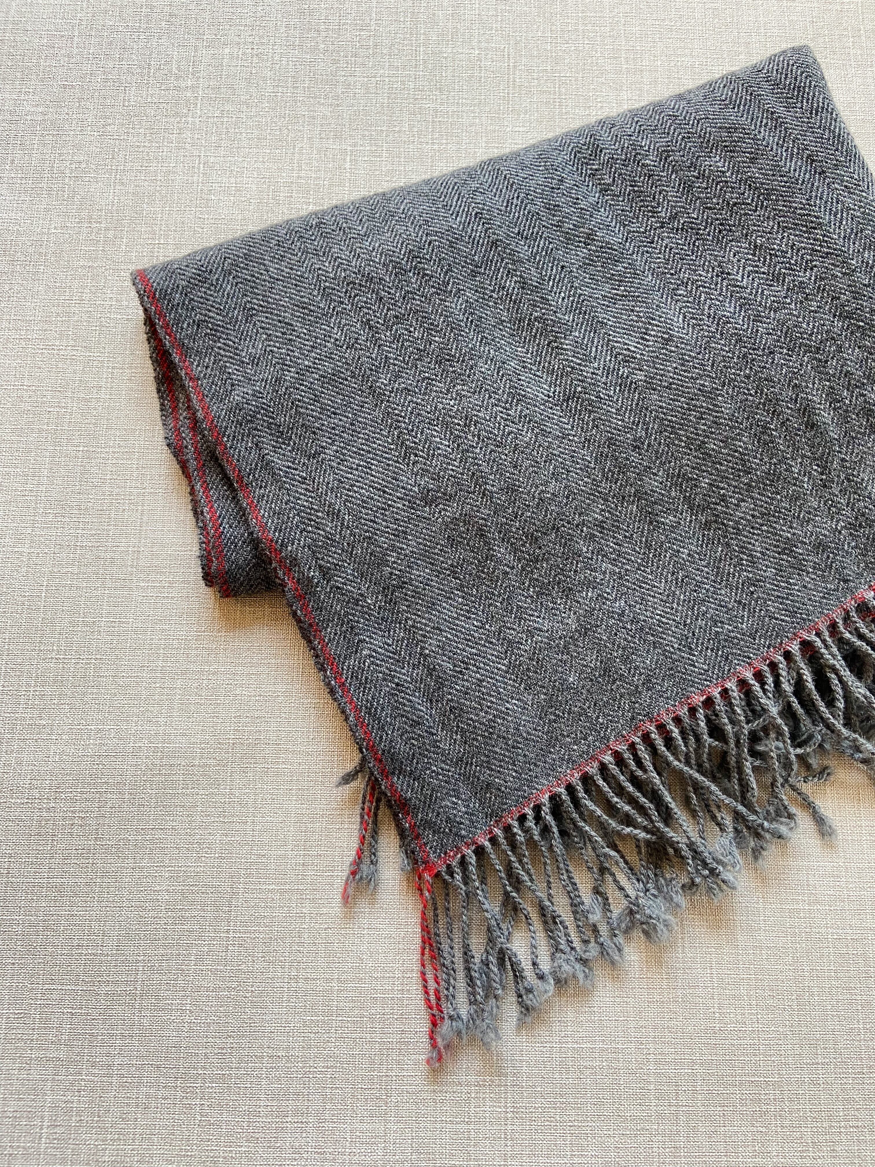 巻いた時、布が揺れた時に見える赤いラインが魅力のショールです。