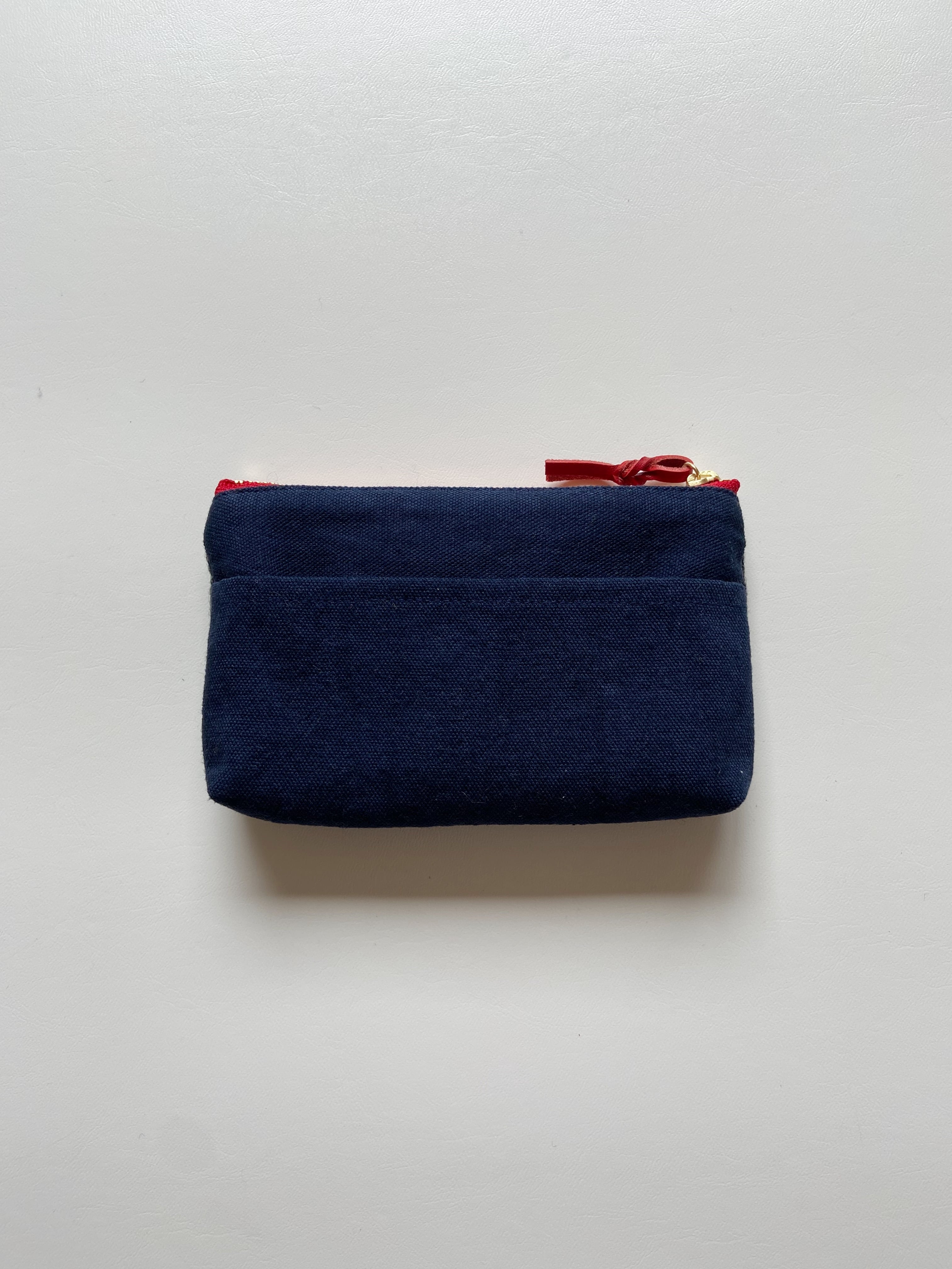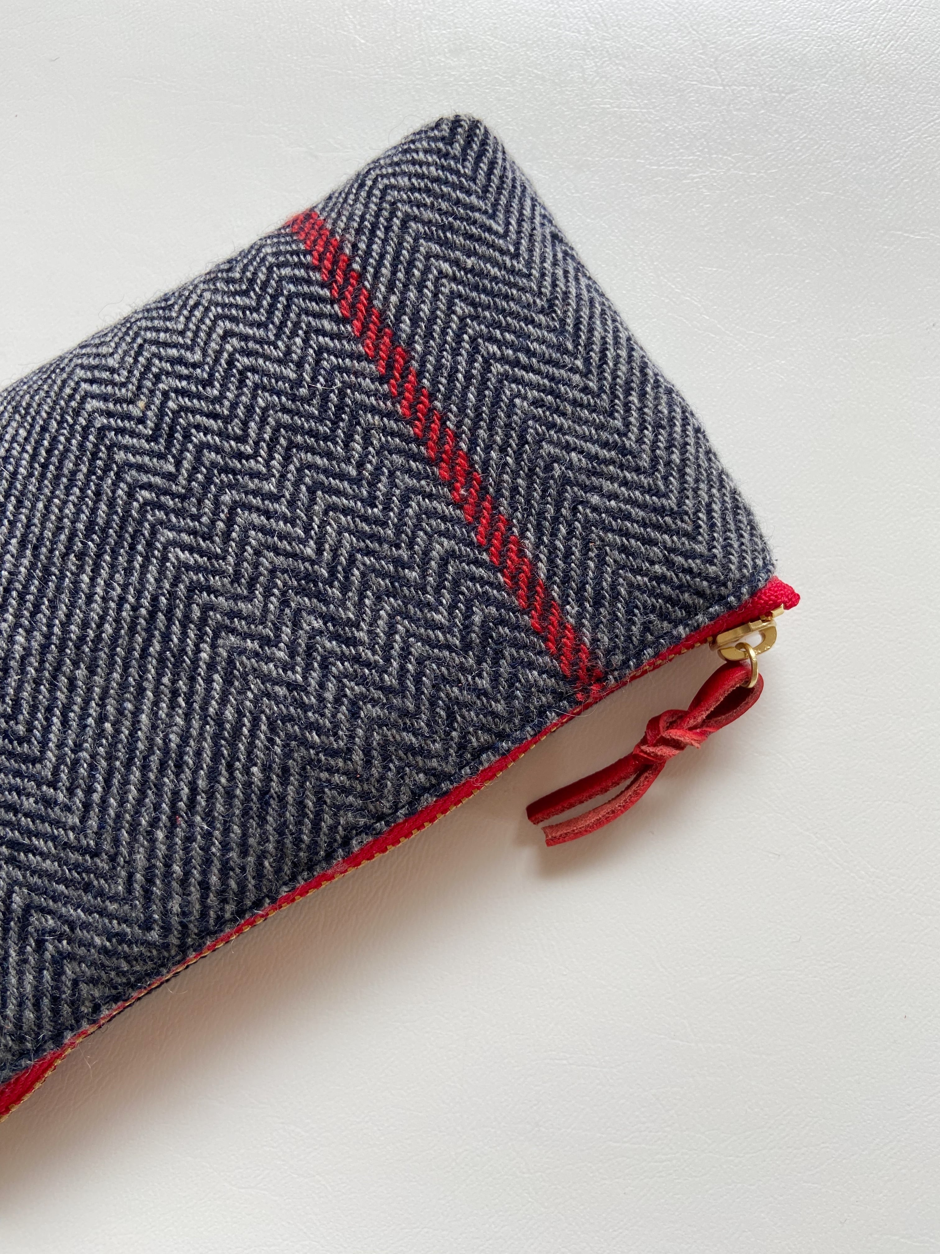 グレーと濃紺をベースにトラディショナルな雰囲気、そして赤をポイントにしたポーチです。